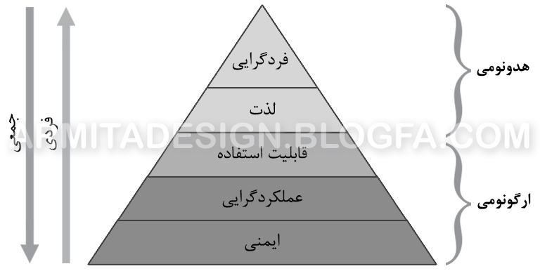 سلسله مراتب نیازهای ارگونومی و هدونومی، بر پایه هرم مزلو تعیین شده است. (مدل مزلو که بهینهسازی رضایتمندی انسان را از طریق سلسلهمراتب نیازها نشان میدهد، مشخص میکند که نیازهای سطح بالا، زمانی برآورده میشوند که نیازهای سطح پایین، تأمین شده باشند.) این سلسله مراتب در دو بخش ارگونومی و هدونومی در تصویر نشان داده شده است.